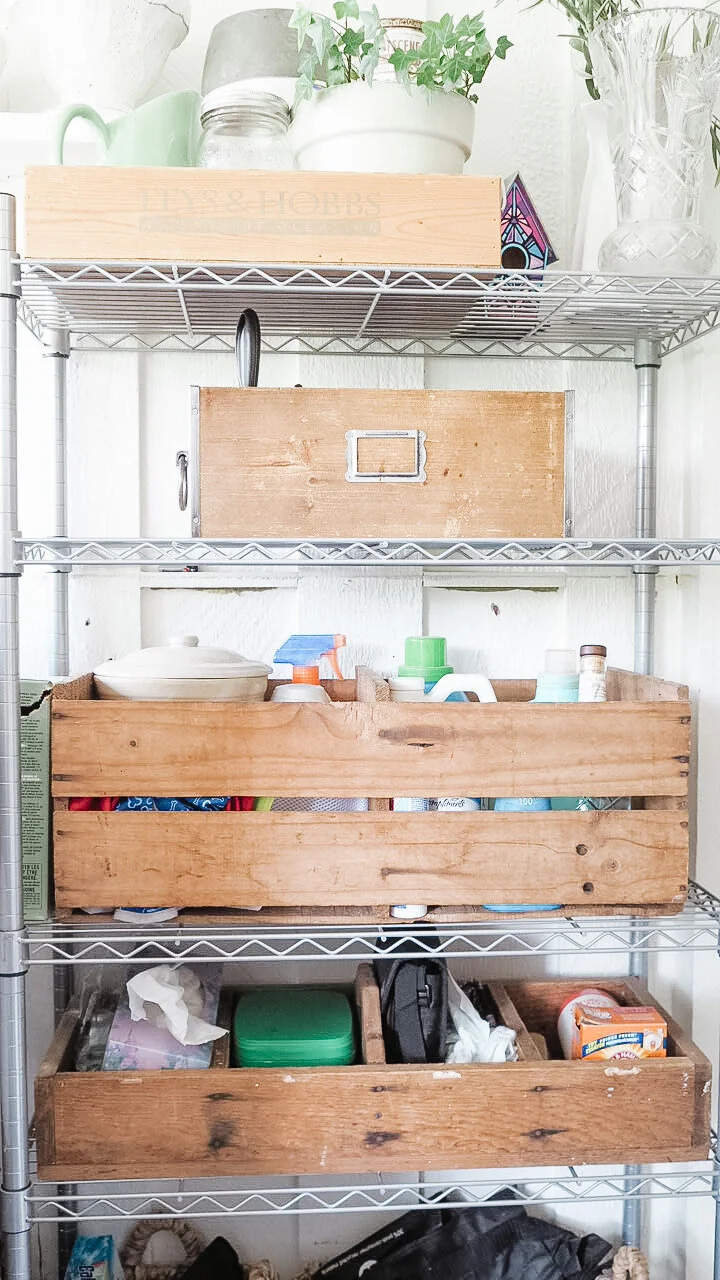 Now down to one old dog, we took out the kennels and replaced them with industrial shelving. We got very lucky to find an assortment of vintage crates to put on the shelves to hold our laundry/utility room bits and pieces. My cousin in England sent us the blackboard/key keeper as a gift (with our surname on it yet!).