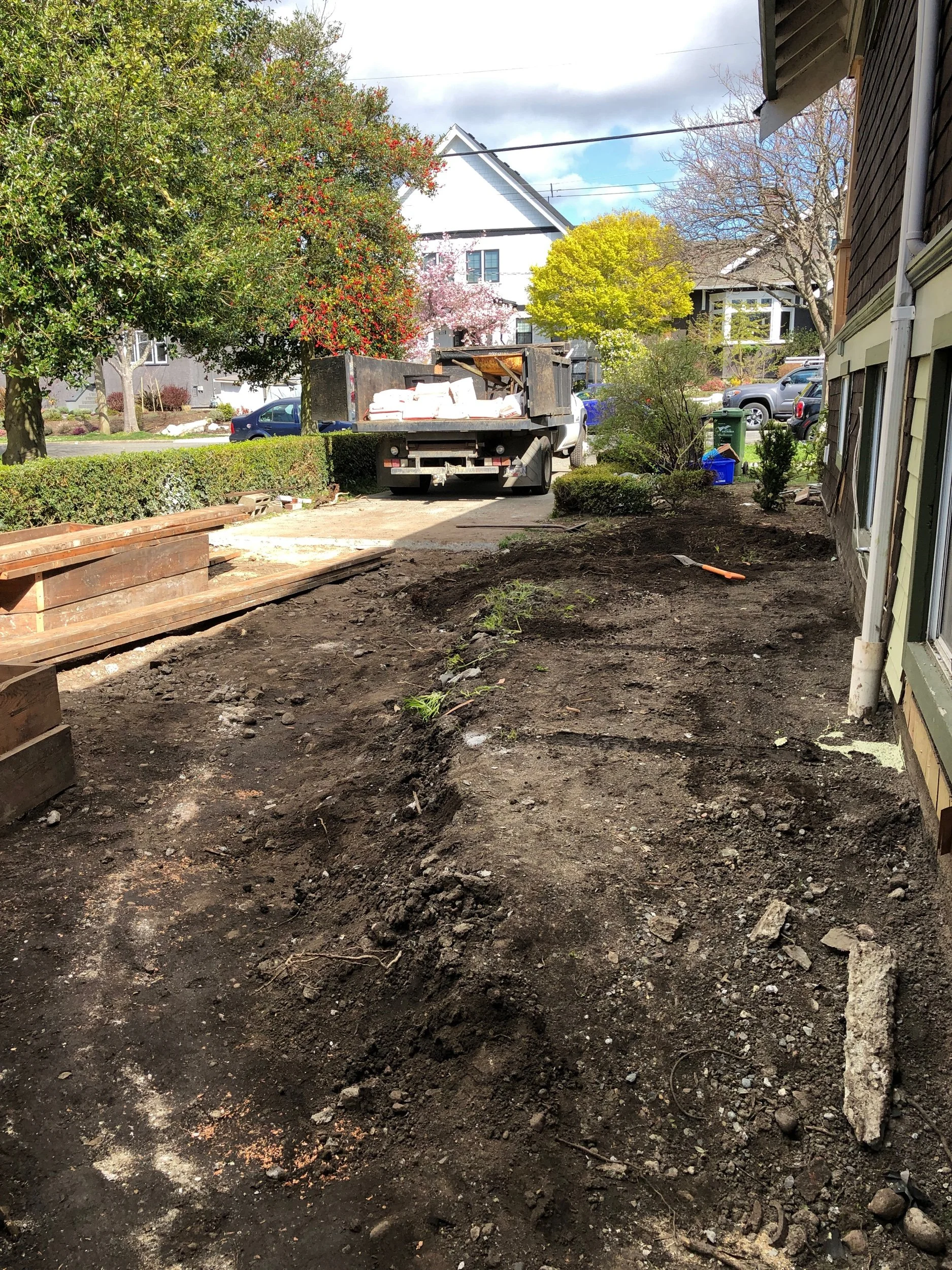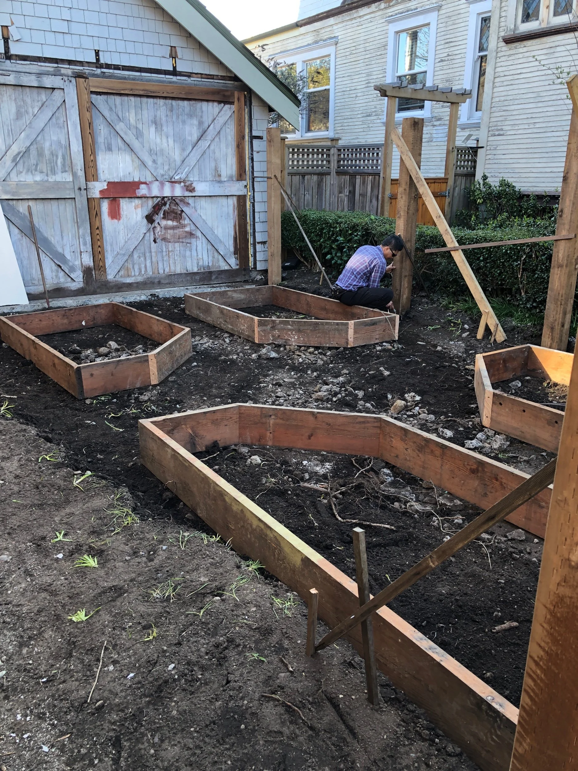 This is the space that I had in mind for my raised beds. Our very long driveway really served no purpose as the garage was being converted into my husband’s workspace. We were willing to give up 30 feet of the driveway to create our cutting garden. The western exposure was a giant stroke of luck. As you can see, we had a big job ahead, starting with jackhammering up that portion of the driveway. Thank you to our dear neighbour Mike for his machinery and expertise. That concrete was so thick!!