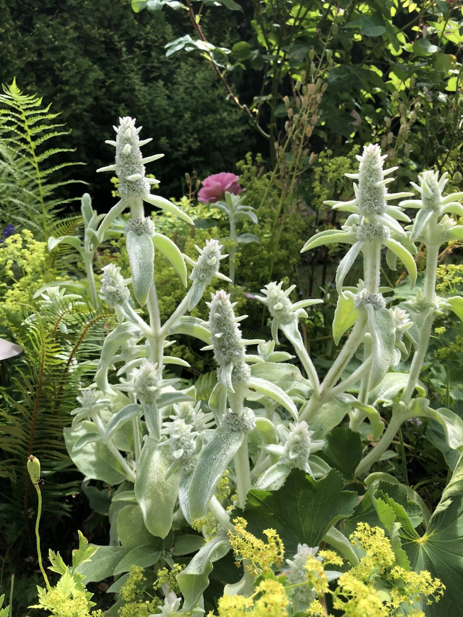 Stachys byzantia, or more sweetly called, Lamb’s Ears. I use the flower spikes in arrangements.
