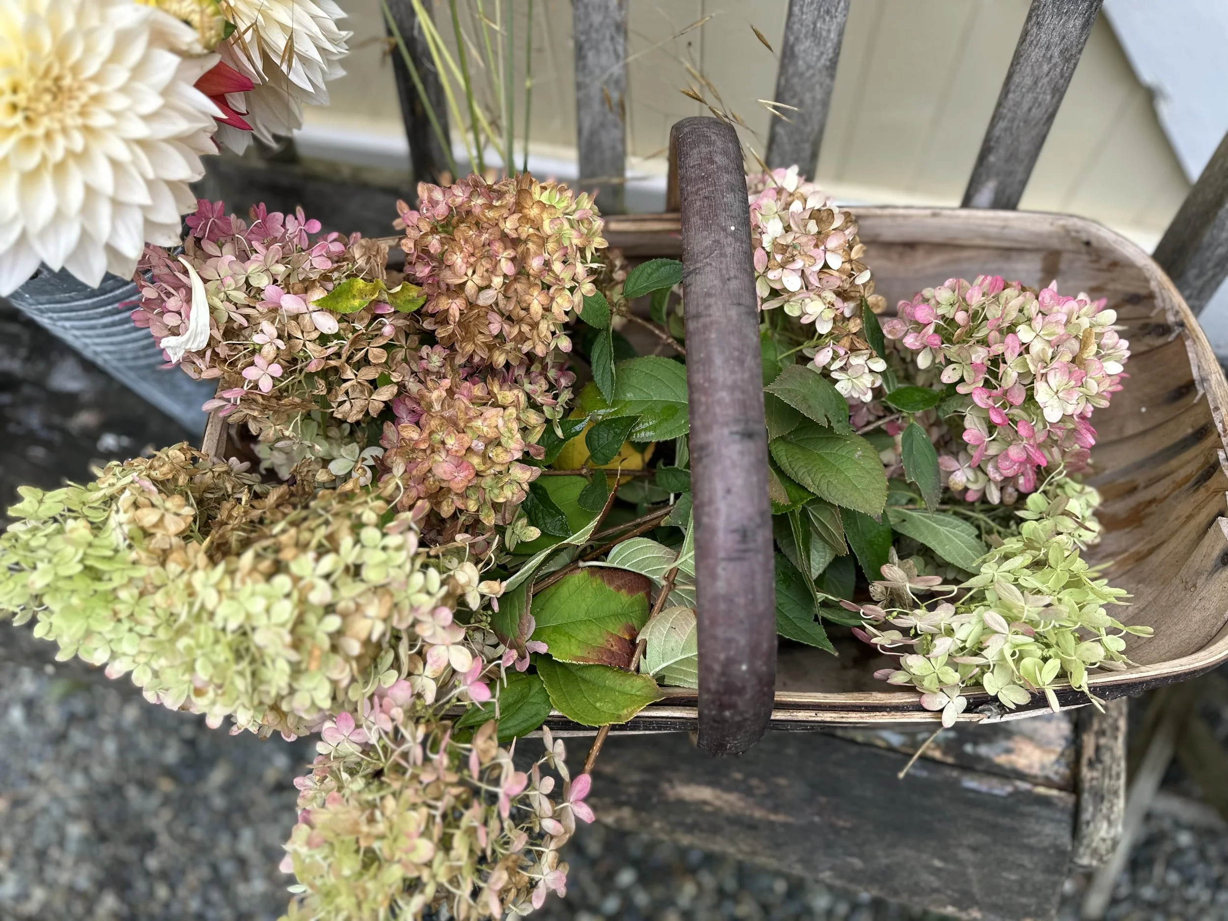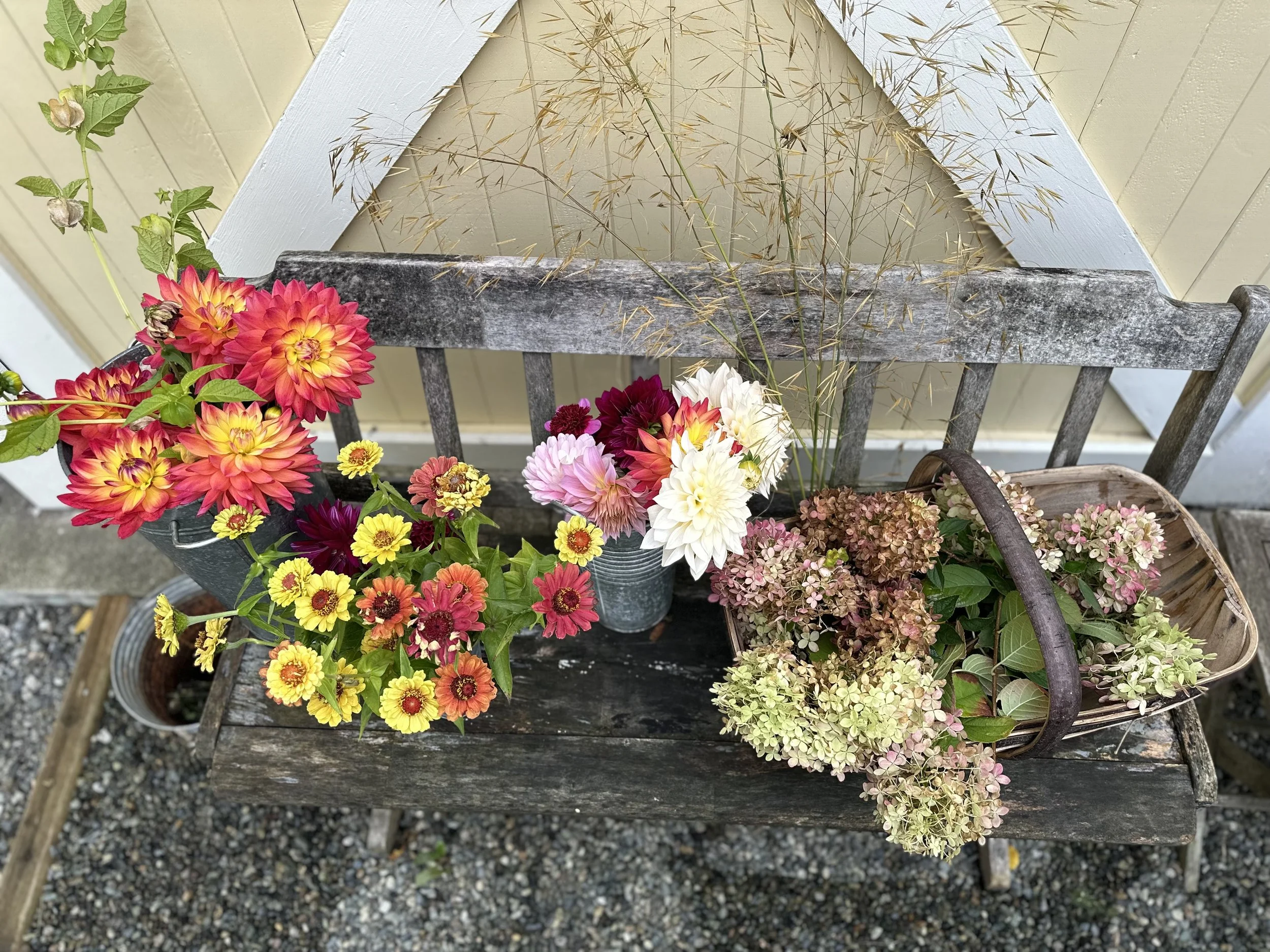 The season is winding down in my cutting garden. I have my fingers crossed that my dahlias keep blooming for a little longer. I know that the inevitable will happen when the temperature drops so today I cut everything that was blooming and decided to make one big bouquet using all the flowers.