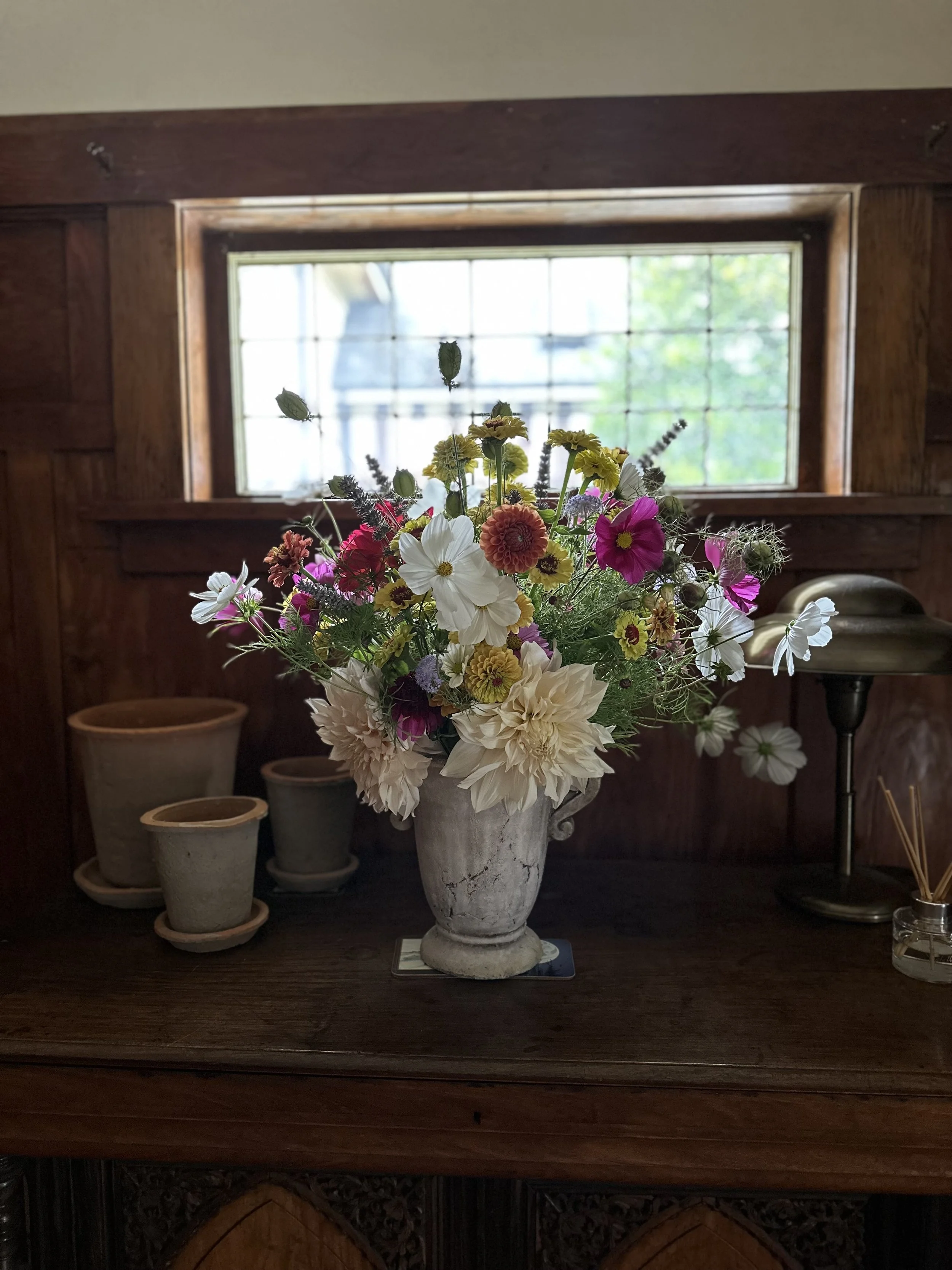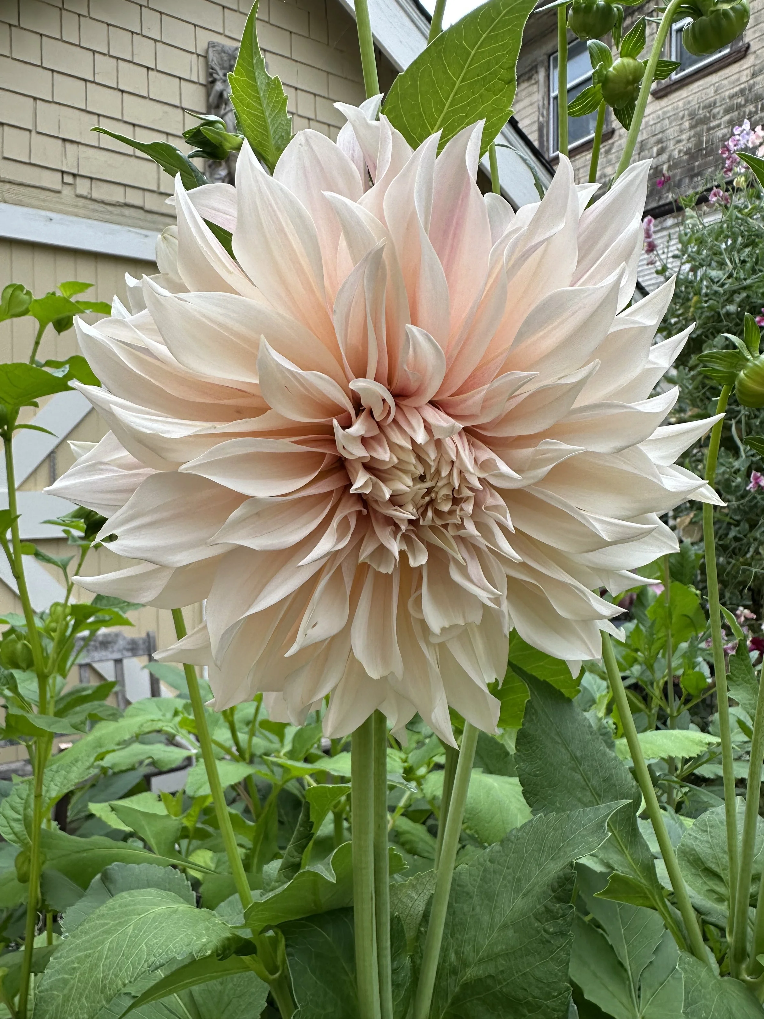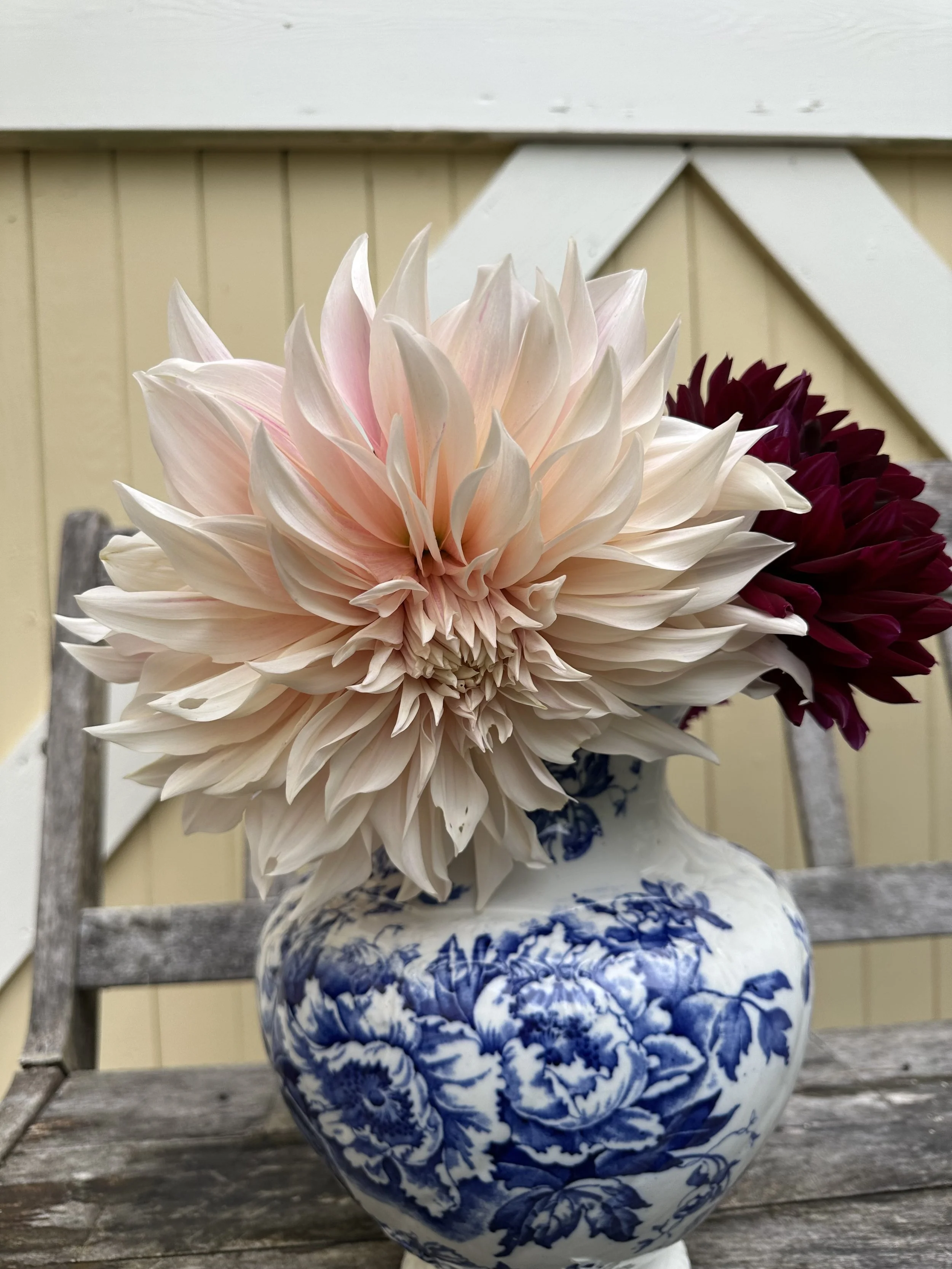 I have been growing Café au Lait for several years and it still stops me in my tracks. I understand because of its size some find it hard to arrange but I don’t feel this way. I make it work. No matter what the arrangement consists of, the Café au Lait are the stars. It is a huge favourite for wedding work. Each bloom seems to have hues all of its own. Some more cream and others tinged with pink. Sublime!